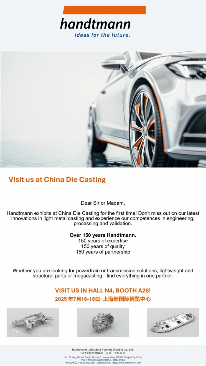 后副車架 “我們通過與終端客戶共同開展設計和研發工作,采用創新性輕量化結構設計,在提升產品性能的同時實現減重,進而優化成本。”漢特曼全球技術負責人Mr. Andreas Wurzer表示。這種以客戶為中心的創新模式,使公司產品在市場上具備顯著的差異化競爭力。 漢特曼對本次“2025上海國際壓鑄展”寄予厚望。公司期望借助這一平臺,進一步推動漢特曼品牌在中國市場的推廣與應用,同時拓展本土客戶,尋求新技術合作機會。“我們期待與同行深入交流學習,共同推動壓鑄行業發展。”漢特曼市場營銷負責人Mr. Jens Rall說道。 全球化布局,深耕中國市場 作為一家擁有150年歷史的歐洲家族企業,漢特曼在輕金屬鑄造領域積累了豐富經驗。早在2005年,公司便開始在全球范圍內布局,目前已在多個國家設立了6座工廠。在中國,漢特曼天津工廠已擁有10年生產經驗,成為公司全球化戰略中的關鍵一環。 “中國是全球最大的汽車產銷國,也是世界最大的壓鑄市場,市場潛力巨大。我們深知中國市場的重要性,并堅定看好其未來發展前景。因此,漢特曼將持續深耕中國市場,致力于為客戶提供優質產品和服務,以滿足不斷升級的市場需求。”漢特曼天津工廠總經理袁剛先生強調。 應對挑戰,技術創新引領未來 面對壓鑄行業“行業內卷加劇”“國際貿易摩擦”以及“內需市場波動”等挑戰,漢特曼展現出堅定的信心與清晰的戰略。公司認為,隨著壓鑄產品在汽車領域應用的不斷拓展,特別是中國汽車產銷的穩定增長,這些挑戰只是暫時的,行業最終將回歸良性、可持續發展狀態。為此,漢特曼將技術創新作為核心驅動力,致力于新材料的開發與應用、輕量化設計以及新工藝的研發,以提升在全球市場的競爭力。 “我們將繼續加大在技術創新方面的投入,不斷提升產品性能和質量,滿足客戶日益增長的需求。”漢特曼集團 Co-CEO Mr. Dirk Seckler表示,未來,公司將以更加開放的心態和務實的行動,與行業同仁攜手共進,共同開創壓鑄行業的美好未來。 漢特曼上海壓鑄展邀請函