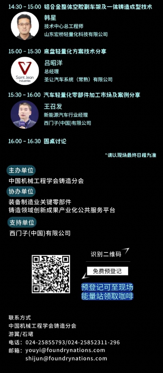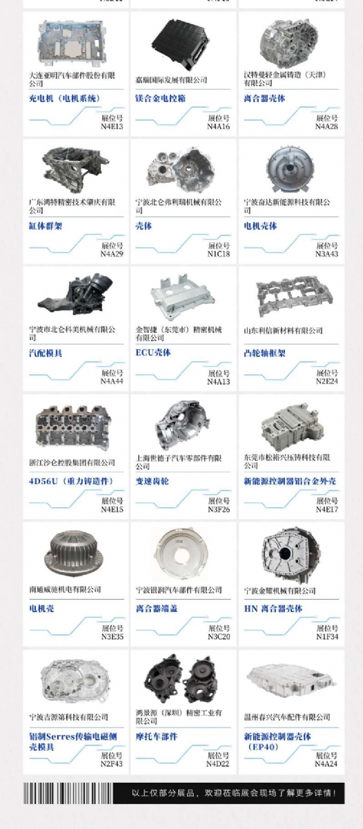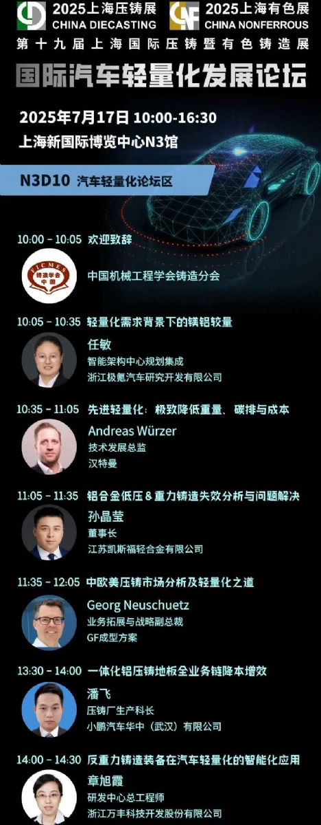 2壓鑄工藝如何破解電驅行業痛點? 1. 輕量化與強度:采用高強鋁合金(如A380,AlSi10MgMn)和鎂合金,結合高真空壓鑄(孔隙率<0.5%),抗拉強度超300MPa,延伸率達到10%,可焊接的壓鑄件,完完全全的實現減重30%~50%。 2. 高集成度:通過超大型一體化壓鑄(如6000T以上壓鑄機)減少零件數量,嵌件工藝預埋鑲件/冷卻管路,提升結構剛度。 3. 降本增效:開發免熱處理合金(如AlSi9MnMoZr)省去熱處理步驟,智能模溫控制將廢品率降至2%以下。 4. 散熱與密封:一體化成型隨形冷卻流道,高真空壓鑄(≤5mbar)結合納米涂層實現IP69K防護。 5. 可持續制造:再生鋁合金(如ADC12-R)和低碳鎂合金減少75%碳排放。 典型案例:特斯拉、蔚來采用一體化壓鑄減重25%;比亞迪高真空壓鑄實現IP69K;力勁、伊之密、海天、布勒提供關鍵設備與工藝支持。壓鑄工藝正推動電驅向“少零件、高性能、低成本”升級。 “沒有壓鑄工藝的進步,電驅系統的集成化設計只能是紙上談兵。”——某電驅企業技術總監 3來7月上海國際壓鑄暨有色鑄造展,見證電驅供應鏈的下一代解決方案 時間地點:2025年7月16日-18日 | 上海新國際博覽中心 聚焦展商:570+壓鑄全產業鏈企業匯集,3天看遍全球壓鑄行業精品 同期活動: 汽車輕量化論壇(含極氪、小鵬等主機廠案例分享);