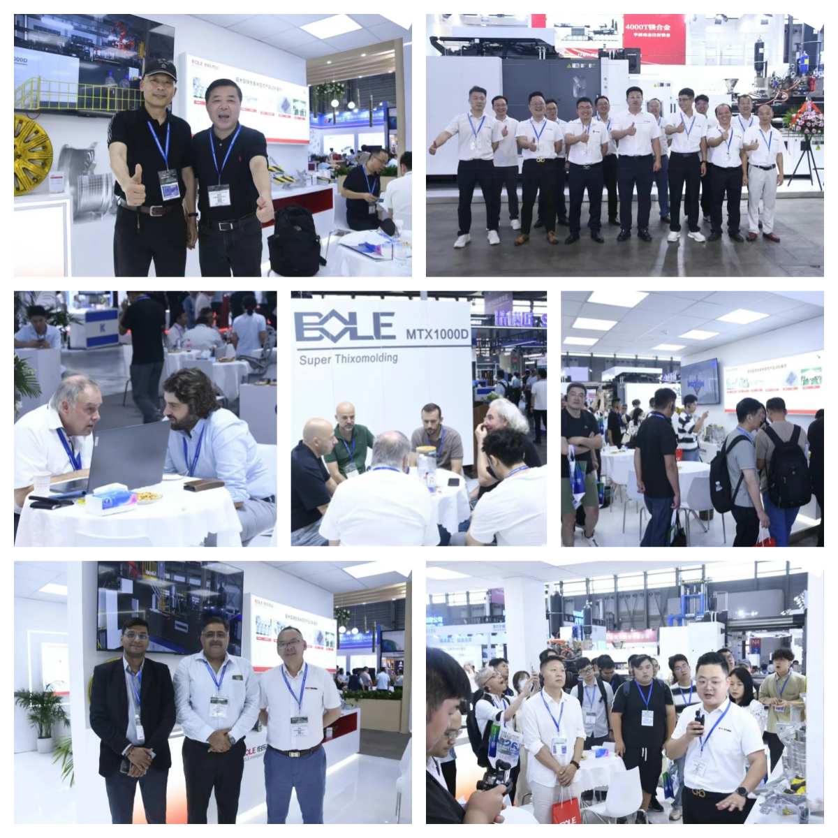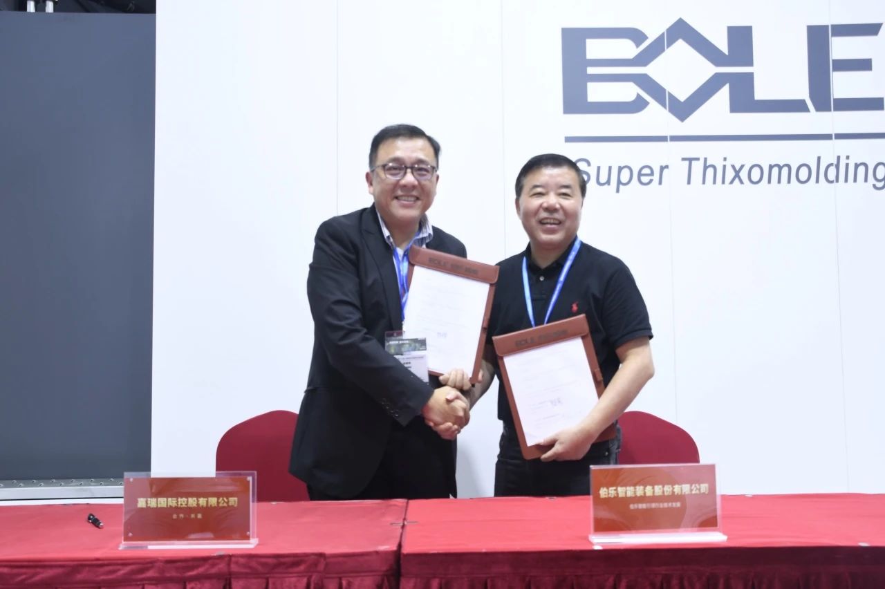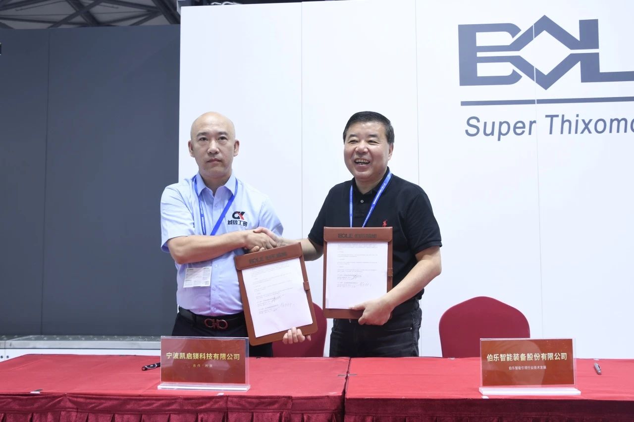 展會盛況 工藝革新:采用半固態觸變成型技術,將鎂合金顆粒加熱至半固態后直接注射,無需熔爐與保護氣體,從源頭消除氫脆、氧化夾雜等缺陷,產品良率從傳統工藝的75%提升至95%,單件生產周期縮短40%。 能效躍升:通過伺服電機與液壓系統深度耦合設計,配以專利的特殊軟件算法設備能耗較傳統壓鑄降低35%,單臺年節電量相當于減少碳排放800噸,契合歐盟碳關稅(CBAM)等國際綠色貿易壁壘要求。 應用拓展:伯樂智能成功試制新能源汽車鎂合金電機殼體,實現鎂合金在高壓電機核心部件的首次規?;瘧茫^鋁合金減重35%、散熱效率提升20%,為800V平臺熱管理提供關鍵解決方案;同步突破鎂合金輪轂等部件的半固態成型工藝,形成覆蓋動力、底盤系統的全場景輕量化技術矩陣。 02 戰略簽約:五大巨頭共筑“鎂基價值鏈”