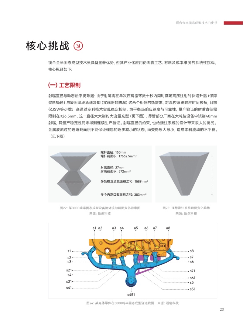 《鎂合金半固態成型技術白皮書》部分內容 主題演講持續2天,現場座無虛席,吸引了眾多關注輕量化解決方案的參展者參加。 適創科技薛鵬基總監結合白皮書內容,深入剖析了該技術在實現復雜、薄壁、高強輕量化部件制造上的獨特優勢,特別是在新能源汽車、3C電子、人形機器人等對減重和性能要求嚴苛領域的巨大潛力。同時,薛鵬基總監詳細闡述了當前工藝面臨的核心約束與挑戰,指出該技術產業化推廣的主要難點。