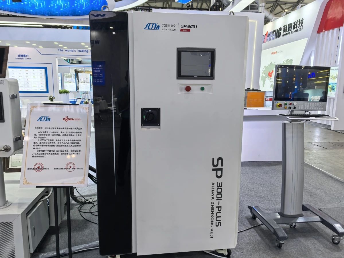 艾嘉亞張軍平總經理為現場觀眾介紹產品 SP - 3001PLUS:免維護多級,性能優異 SP - 3001PLUS免維護多級高真空系統堪稱艾嘉亞的明星產品。它采用雙級無油爪式提供動能,運用多級真空壓室控制單元、頂針控制單元、型腔真空檢測單元,能在不同工藝條件下靈活完成多種組合模式抽吸要求。結合真空度及真空流量雙向實時在線調節技術,該系統可有效提高型腔中氣體在低速壓射過程中的排出效率,使真空度提升1個數量級,真空流量提升2 - 3倍,從而確保壓鑄過程的穩定性。