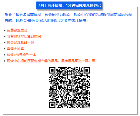 由鑄造行業(yè)生產(chǎn)力促進(jìn)中心、中國(guó)機(jī)械工程學(xué)會(huì)鑄造分會(huì)(FICMES)舉辦的CHINA DIECASTING 中國(guó)壓鑄展將于2018年7月18-20日在上海新國(guó)際博覽中心舉辦。展會(huì)面積達(dá)到36,000平方米,參展企業(yè)400余家,專業(yè)觀眾達(dá)18,000余人,將為壓鑄行業(yè)帶來(lái)一場(chǎng)專業(yè)化的視聽(tīng)盛宴!