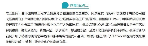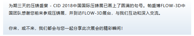 帕盛博FLOW-3D中國團(tuán)隊(duì)的技術(shù)經(jīng)理郝平先生分享了“壓鑄行業(yè)數(shù)字化工廠之仿真技術(shù)” 最后,帕盛博FLOW-3D團(tuán)隊(duì)感謝到訪的所有客戶、行業(yè)觀眾和朋友,我們將始終致力于全方面鑄造工藝的模擬和優(yōu)化,精益求精,時(shí)刻為您提供高效的鑄造工藝解決方案。