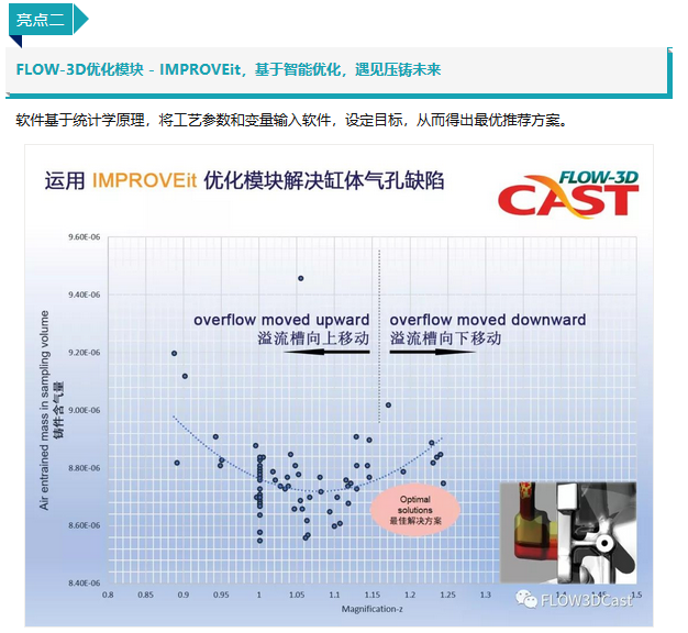 上圖以散點(diǎn)圖的形式,展示了運(yùn)用IMPROVEit優(yōu)化模塊,找出最佳的解決方案,優(yōu)化缸體氣孔缺陷