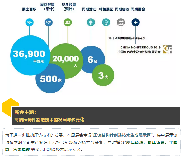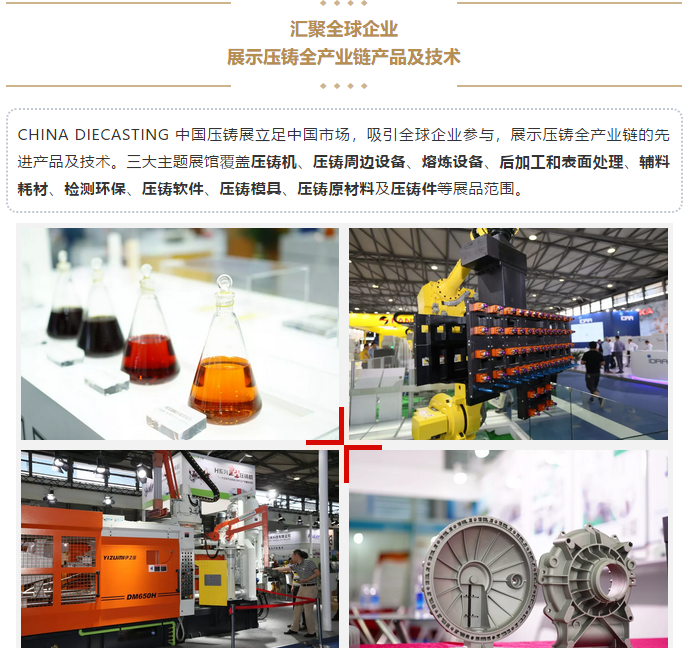 - 優質壓鑄件評選及展示 - 鋁鎂鋅材質鑄件,分類評選,優勝角逐; 汽車技術日:引領未來、專注發展 - 展示、論壇、熱議壓鑄未來科技、探討應用與發展 模具高峰論壇:綠色智能、創新發展 - 模具制造及模具鋼等原材料集結,探討發展思路,推動行業進步 先進有色日: