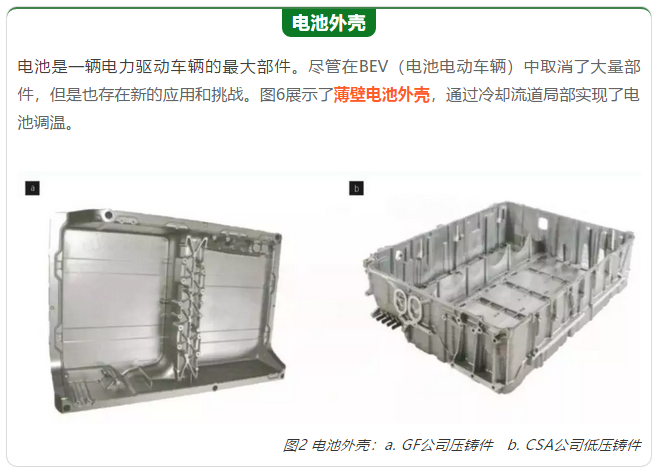 不管是電動汽車,還是混合動力汽車都必須變得更輕,以補償電池所增加的重量,并延長行使里程。除了電動汽車不再需要的部件外,壓鑄工藝還提供了作為鑄造工藝滿足輕量化這一趨勢要求的可能性。由于可以實現極小的壁厚,通過部分復雜冷卻流道實現電池調溫的薄壁電池外殼和支架,顯示了鑄件的未來潛力。鑄造工藝為部件輕質化設計提供了多種可能性。它允許高度的設計自由度,以便將合適的材料放置在合適的位置,并有助于將多個功能集成到一個部件中。