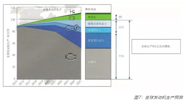 在(圖7)中可以看到對全球發動機產量所進行的預測。這一預測以IHS(埃士信)公司所進行的調查和AVL(李斯特)公司的內部分析作為基礎。根據分析,2025年全球范圍內用于不同類型車輛的內燃機產量將達到1億臺。根據這一預測,可以估計,到2025年,汽車鑄件的市場增長率約為23%。不同類型車輛中,例如插電式混合動力車和全混合動力車,所增加的鑄造部件將使得對鑄造產品的需求增加。