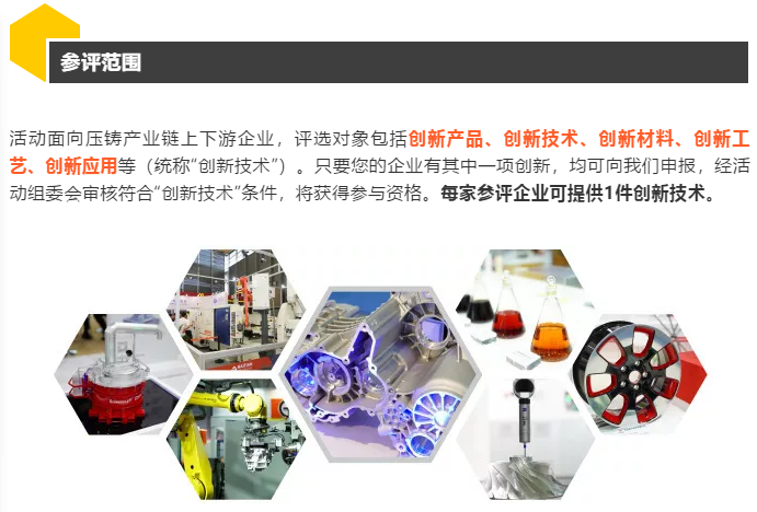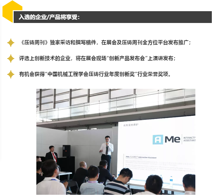 中國機械工程學會鑄造分會聯合行業(yè)知名媒體《壓鑄周刊》共同推出“2019年度壓鑄行業(yè)創(chuàng)新技術評選”活動,旨在鼓勵壓鑄企業(yè)技術創(chuàng)新、掌握核心技術,在全行業(yè)內形成創(chuàng)新風尚,提升企業(yè)競爭力,推動行業(yè)技術進步!現活動已全面啟動,誠邀壓鑄產業(yè)鏈上下游相關企業(yè)及單位積極參與,共話創(chuàng)新! 2018年“創(chuàng)新日”活動回顧 上屆展會首次設立“技術創(chuàng)新日”活動,活動匯集整個壓鑄產業(yè)鏈的專家與觀眾,以“綠色、創(chuàng)新、智能”為核心的深度交流,聚焦壓鑄行業(yè)“新技術、新產品、新趨勢”創(chuàng)新技術與產品,現場交流。40余家壓鑄上下游企業(yè)提交申請,經過專家系列篩選后,30余件最新產品、技術和設備在展會現場進行演講發(fā)布。活動上人潮涌動,熱議“創(chuàng)新”!