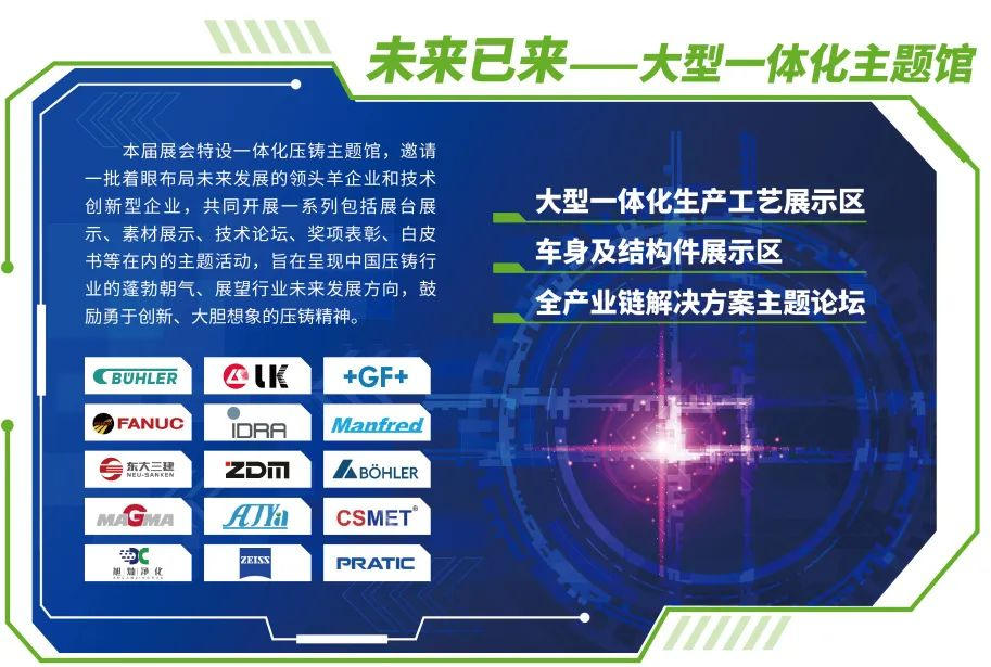 2022年展會全新打造主題館—— “未來已來,大型一體化壓鑄”,涵括了一體化壓鑄技術(shù)及裝備展覽,一體化壓鑄專業(yè)技術(shù)報告演講,一體化壓鑄產(chǎn)業(yè)鏈成果展示。 屆時,壓鑄產(chǎn)業(yè)鏈上下游企業(yè)布勒Buhler、力勁集團(tuán)、意德拉IDRA、喬治費歇爾GF、帥翼馳、寧波臻至、宜興旭燦、發(fā)那科、東大三建、艾嘉亞、卡爾蔡司、博樂特殊鋼、邁格碼、曼弗萊德等知名企業(yè),將展覽和演示在超大型壓鑄島、免熱處理材料、熔煉給料、超大型壓鑄模具、自動化、模擬仿真、高真空、廢氣處理等方面的先進(jìn)技術(shù)、裝備及成果解決方案。