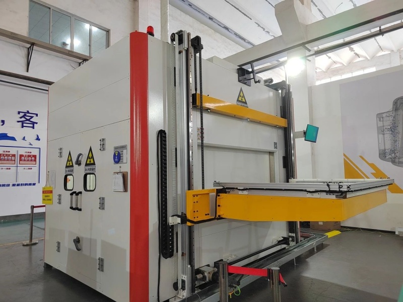 技術(shù)革新特點(diǎn) 高效通過式在線檢測設(shè)備具備離線和在線檢測雙應(yīng)用方式,主要用于汽車副車架、轉(zhuǎn)向節(jié)、汽車?yán)浒宓犬a(chǎn)品進(jìn)行大批量的100%全透視檢測,可有效檢測出產(chǎn)品中存在的裂紋、縮孔、氣孔、夾渣等內(nèi)部缺陷,并能確定缺陷的位置和大小。 該設(shè)備采用托盤雙軌自動運(yùn)輸系統(tǒng),檢測托盤自動升降循環(huán)運(yùn)輸,具有高效的檢測效率;同時(shí),工件托盤采用自動升降循環(huán)的方式,有效減少占地面積,便于安裝布置,可減少投入成本。采用有缺陷自動識別功能(ADR)的X射線檢測技術(shù),能快速、準(zhǔn)確的檢測出鑄件產(chǎn)品中存在的缺陷并對其自動識別和判定,能有效杜絕人工判定的漏判和誤判等。搭載全自動機(jī)械手上下料系統(tǒng),實(shí)現(xiàn)全流程的自動化檢測運(yùn)行。