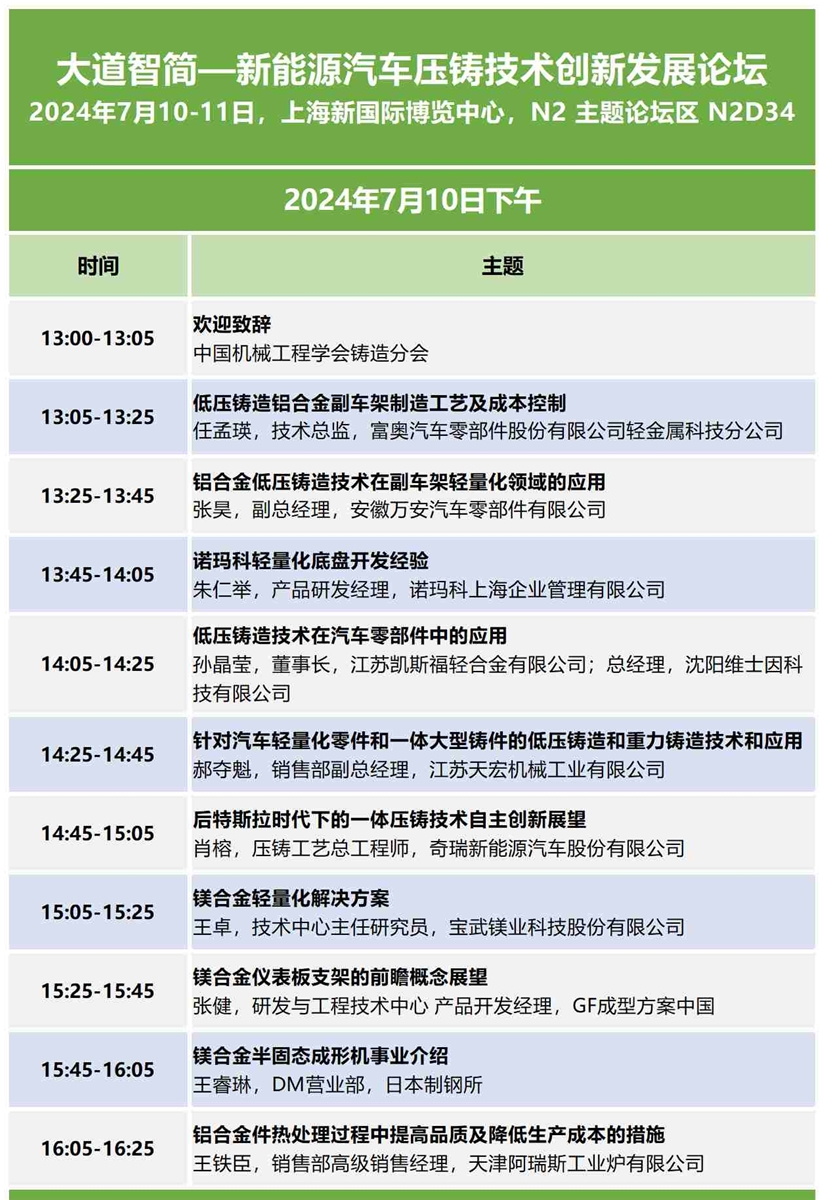 ![]() 2024上海國際有色壓鑄展 (CID & CNF) 順應”新能源汽車發展構建壓鑄全球化新格局“的新趨勢,同期舉辦“大道智簡—新能源汽車壓鑄技術創新發展論壇”,論壇聚焦副車架、鎂合金、數字化、大型一體化壓鑄、低碳可持續等行業熱點話題,近三十場精彩報告將在7月10-11日,上海浦東新國際博覽中心為您呈現! 新能源汽車壓鑄技術創新發展論壇 副車架生產工藝技術專題