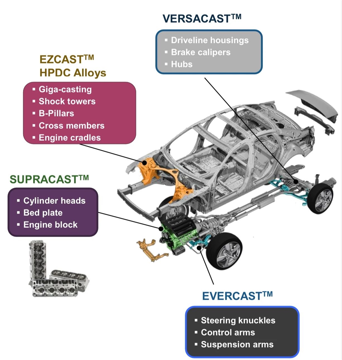 美國鋁業集團高性能鑄造鋁合金產品系列 此外,帥翼馳集團還成功研發并推出了適用于高強鍛造部件和擠壓型材產品的高性能再生鋁合金變形鋁鑄棒,并已實現規?;瘧谩?/p> 胡斌表示,帥翼馳集團在鋁合金材料研發方面,將緊盯碳中和、碳達峰目標以及新能源汽車領域對關鍵鋁合金零部件的需求,致力于為客戶提供高性價比的低碳鋁合金材料產品。