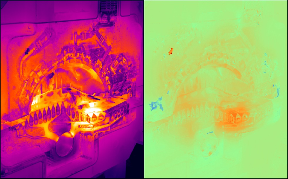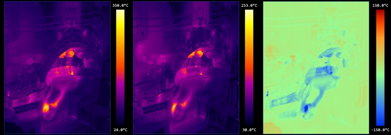 上圖左側為實際紅外圖片,右側為該圖片與標準生產過程的溫度差異圖片,淺綠色代表沒有溫度差異,藍色區域代表溫度偏低,紅色區域代表溫度偏高 根據噴涂前后溫度變化判斷噴涂效果也是用戶關心的問題之一。系統會自動對比每次噴涂前后的溫度,并顯示差異圖片。