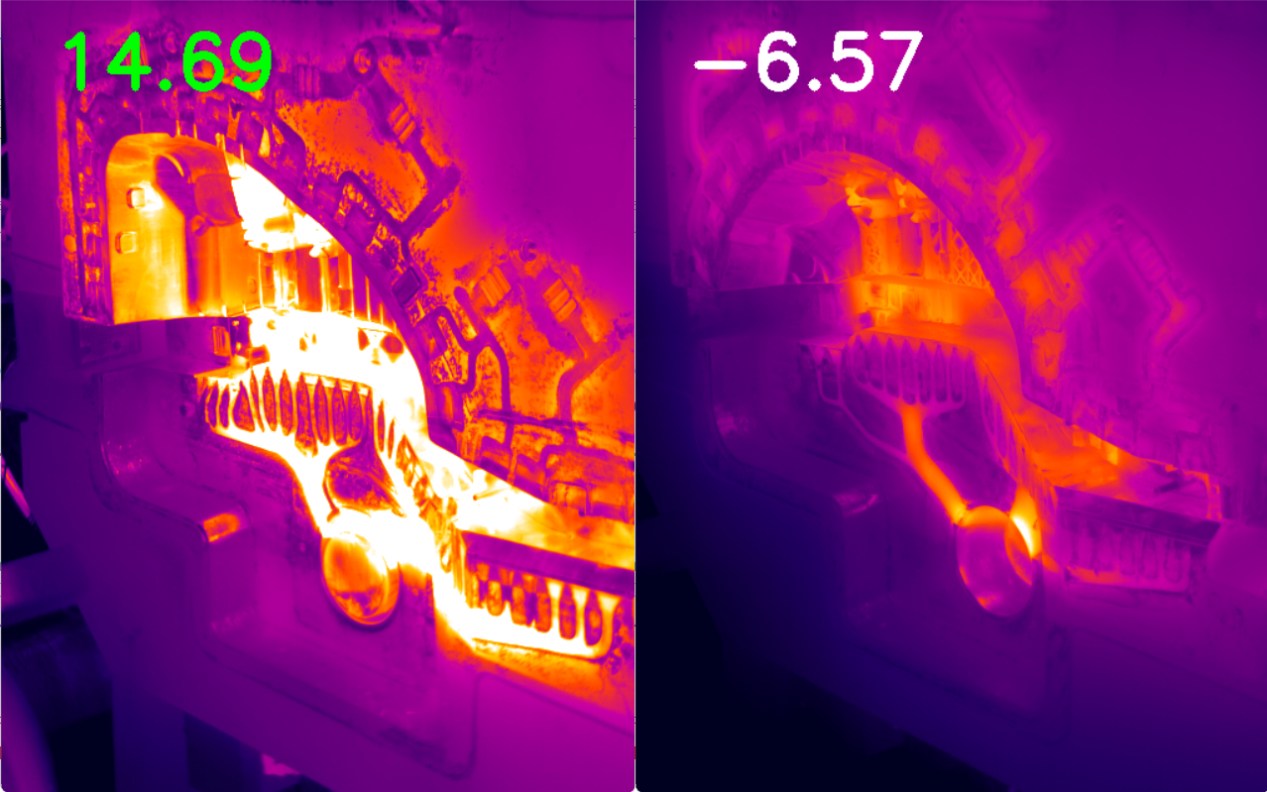 ![]() 模具溫度對壓鑄件質量和成品率有著重要影響,因此,對其進行監控及優化以形成良好的模具熱平衡顯得尤為重要。寧波新昱智能科技有限公司開發的“模具紅外感知系統(MISS)”,通過紅外熱成像相機實時在線監測、記錄壓鑄周期內關鍵時間節點的模具溫度,并對溫度數據進行分析處理,感知壓鑄流程中模具和產品溫度狀態是否正常,實現生產可追溯,為無瑕生產保駕護航。 近期,該系統迎來三項重磅功能升級: 一、兩次測溫差異對比。在模具溫度監控過程中,用戶往往關心此次壓鑄過程的溫度是否在合理區間內,與正常生產過程相比,哪些位置存在溫度差異。在該系統中,用戶可自定義設置標準生產過程圖片作為溫度對比的參考依據。每次進行紅外測溫時,系統會自動將當前測溫結果與之進行對比,并通過不同顏色來展示溫度差異的大小,使溫度狀態一目了然。