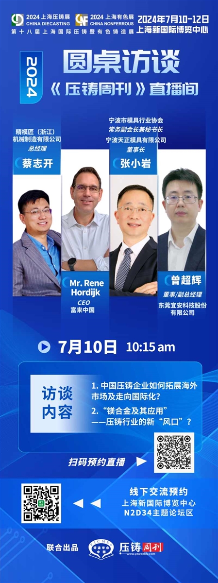 ![]() 《壓鑄周刊》傳媒展臺(tái) 2024年7月10-12日 上海新國(guó)際博覽中心 《壓鑄周刊》傳媒,展位:N3B23 2024年7月10-12日,備受矚目的“2024上海國(guó)際壓鑄展”將在上海新國(guó)際博覽中心舉行。《壓鑄周刊》傳媒,作為展會(huì)的戰(zhàn)略合作媒體和同期活動(dòng)的協(xié)辦單位,將盛裝參加本屆展會(huì)。歡迎業(yè)界同仁光臨指導(dǎo)交流。展位號(hào):上海新國(guó)際博覽中心N3館N3B23。 展會(huì)期間,《壓鑄周刊》傳媒還將攜手主辦單位,聯(lián)合舉辦“壓鑄行業(yè)年度創(chuàng)新技術(shù)發(fā)布會(huì)”,以及圍繞“壓鑄企業(yè)出海”、“鎂合金產(chǎn)業(yè)發(fā)展”兩個(gè)主題的“圓桌訪談”等活動(dòng),歡迎業(yè)界同仁前往論壇區(qū)觀看。 主題活動(dòng)(一)