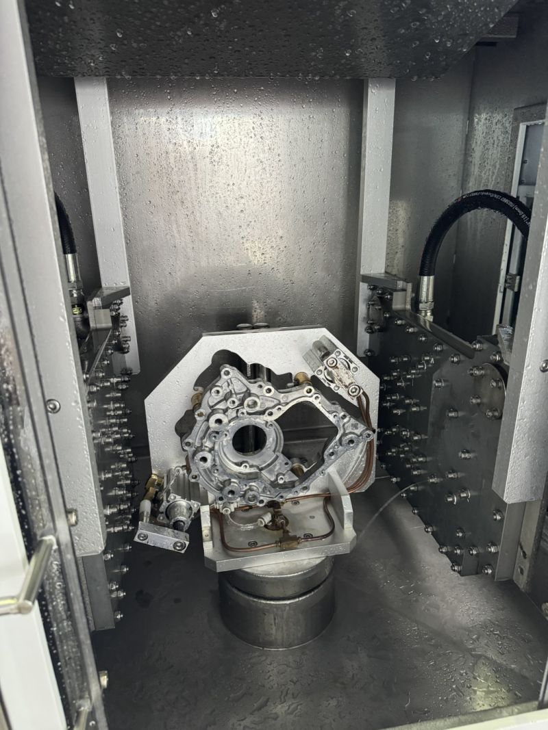 廣東賽宏參展團隊 廣東賽宏總經理余松先生指出,鋁合金壓鑄件的清洗面臨諸多挑戰(zhàn),包括材質的特殊性、清洗效果的難以保證、復雜的清洗工藝、嚴格的環(huán)保和安全要求,以及自動化清洗的實現等。為了克服這些難點,廣東賽宏不斷研發(fā)和改進清洗技術、工藝和設備,提升操作人員的技能和經驗水平,并加強環(huán)保和安全措施的實施。 作為壓鑄行業(yè)的專業(yè)級清洗設備供應商,廣東賽宏一直致力于壓鑄件的表面清洗及設備的研發(fā)制造。為提升壓鑄產品的清潔度,公司持續(xù)投入研發(fā),并在公司內部建立了完善的多種模式的試驗設備和清潔度檢測設備,以滿足客戶售前的測試要求。通過多種工藝的組合測試,廣東賽宏為客戶提供多樣化、高清潔度的清洗工藝解決方案。 此次展出的單體式機邊隨形清洗機,具有占地面積小、定位精度高、清洗潔凈度高等特點。該設備可直接放置在CNC加工中心后,進行直接清洗。經過后端的單體式真空干燥后,產品可直接包裝出貨,減少了產品周轉帶來的其他風險。同時,該設備還具備定點定位清洗功能、定孔吹干功能、旋轉脫水功能以及超凈過濾循環(huán)功能。在當前的市場環(huán)境下,因其投入小且能解決一些大的清洗問題,所以備受客戶歡迎。