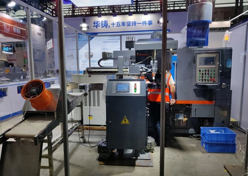 此次展出的無料咀高速精密壓鑄機,憑借其從分型面進料的獨特結構設計,使熱室壓鑄生產效率達到極致。壓鑄毛坯件無料咀、無披鋒,生產更穩定,產品品質更高,從而提升壓鑄件電鍍良率,其生產周期可達2-4秒/模。由于鑄件產品無料咀,合金原料節省幅度可達30%-50%。同時,產品無披鋒,省去了打磨和后處理工序。 尤為值得一提的是,華鑄科技的無咀高速精密壓鑄機在生產薄壁件、精密件產品方面具有顯著優勢。該壓鑄機已與標準模架組合,無需單獨制作模架,只需制作模芯,實現快速開模、快速換模,讓客戶在最短時間內投產,快速創造價值。在華鑄科技的展臺上,高速噴取一體機、帶風冷的輸送帶與無料咀壓鑄機共同組成了高速高效熱室壓鑄單元。其中,華鑄科技的高速噴取一體機以其快速高效的特點,適用于不同噸位的壓鑄機,進一步提升了生產效率。 |