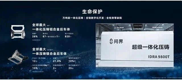 圖源:賽力斯汽車 賽力斯超大一體壓鑄鎂合金后車體白車身的試制成功,標志著鎂合金后車體正式從零部件走向了整車、由實驗室走向了量產應用。該成果有48項技術攻關,并有12項為行業0到1的關鍵技術突破,相比傳統鋁合金方案可實現21.8%的減重效益、整體性能提升10%以上。