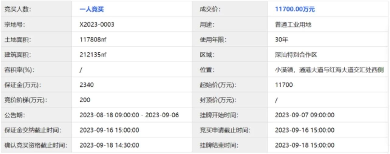 來自深圳市公共資源交易中心消息,9月18日,比亞迪以底價1.17億元新競得深圳市深汕特別合作區一宗工業用地,土地面積117808平方米,建筑面積212135平方米,土地用途為普通工業用地,準入行業類別為新能源行業。根據規劃,該宗地將用于建設深汕比亞迪汽車工業園二期項目。