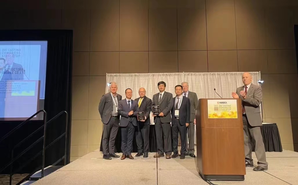此次盛會頒發了北美壓鑄協會諸多年度大獎,其中,最值得關注的是最佳結構件評比大獎(Aluminum Structural),堪比壓鑄界的奧斯卡。經過激烈的競爭和評比,繼去年之后,本次最佳結構件評比大獎再一次頒給了國內車企的大型一體化壓鑄部件。由賽力斯汽車主導設計、文燦集團制造、帥翼馳新材料集團/美鋁供應材料,三方聯合申報的“集成輪罩后地板總成(Rear Floor with Wheel Covers)方案”摘得桂冠。