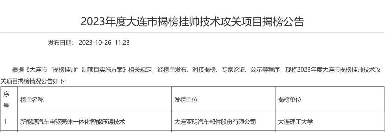 10月26日,大連市科技局發布了2023年度大連市揭榜掛帥技術攻關項目揭榜公告。大連亞明汽車部件股份有限公司的“新能源汽車電驅殼體一體化智能壓鑄技術”獲得2023年度大連市揭榜掛帥技術攻關項目立項。