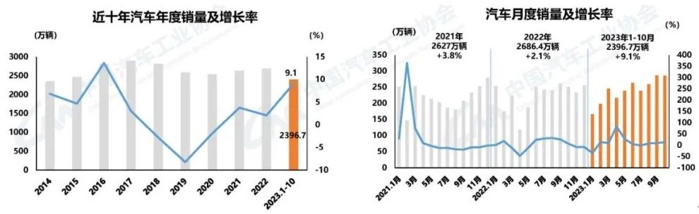 2023年10月,汽車產銷分別完成289.1萬輛和285.3萬輛,同比分別增長11.2%和13.8%。汽車產銷繼9月后再創當月歷史同期新高。其中,乘用車產銷分別完成251.3萬輛和248.8萬輛,同比分別增長7.6%和11.4%;商用車產銷分別完成37.8萬輛和36.5萬輛,同比分別增長42.7%和33.4%;新能源汽車產銷分別完成98.9萬輛和95.6萬輛,同比分別增長29.2%和33.5%,市場占有率達到33.5%。 1-10月,汽車產銷分別完成2401.6萬輛和2396.7萬輛,同比分別增長8%和9.1%。其中,乘用車產銷分別完成2073.1萬輛和2066.4萬輛,同比分別增長6%和7.5%;商用車產銷分別完成328.6萬輛和330.3萬輛,同比分別增長22.1%和19.8%;新能源汽車產銷完成735.2萬輛和728萬輛,同比分別增長33.9%和37.8%,市場占有率達到30.4%。 |