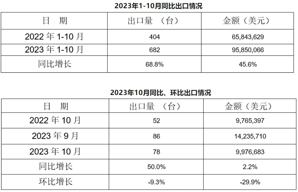 其中,壓鑄機業(yè)務收入19.97億港元,同比減少2.6%;注塑機業(yè)務收入6.78億港元,同比增長2.7%;加工中心業(yè)務收入7947.9萬港元,同比減少47.1%。公司表示,由于下游客戶資本開支放緩,大部分機器的交付周期延遲集中在下半財年,導致上半財年的業(yè)務收入同比略有下滑。 1-10月冷室壓鑄機出口682臺 來自中國鑄造協(xié)會的消息,根據海關數據統(tǒng)計,2023年1-10月,冷室壓鑄機共計出口682臺,同比增長68.8%。其中:10月出口78臺,同比增長50%,環(huán)比下降9.3%。