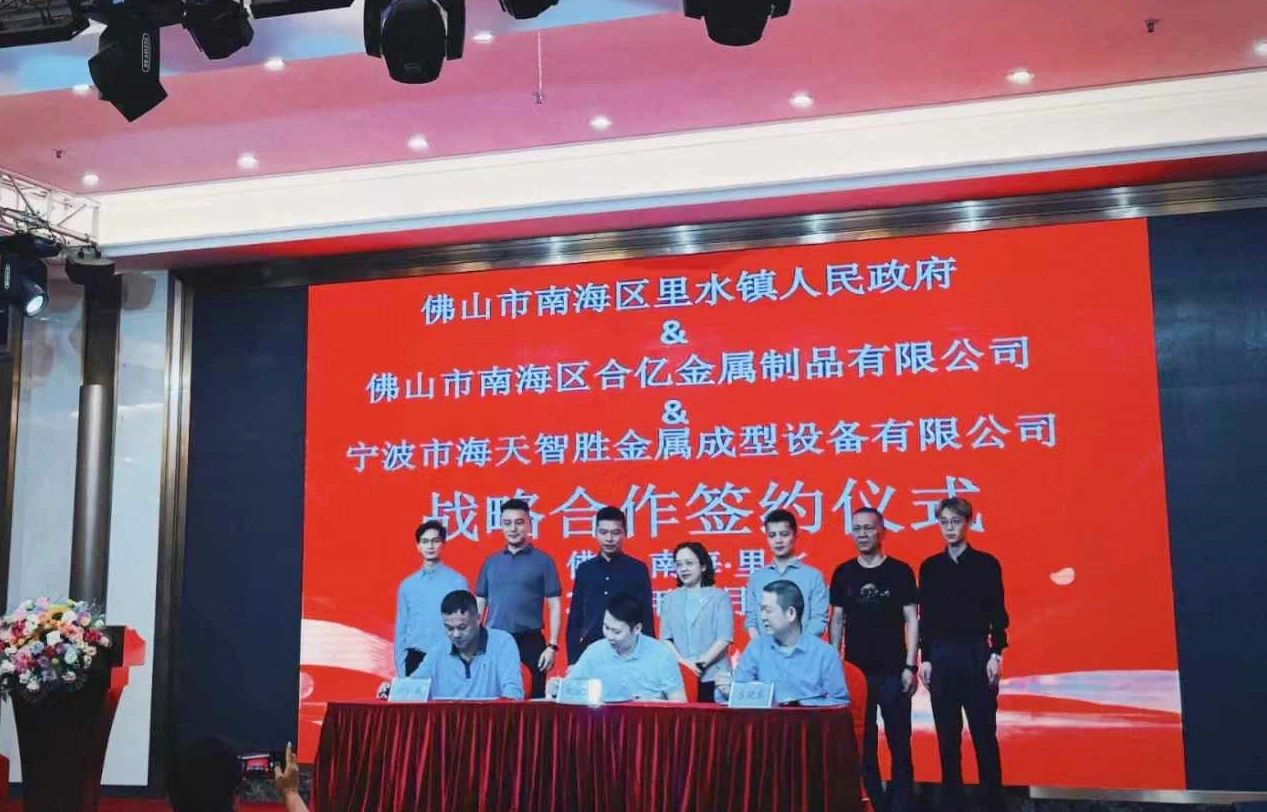 佛山合億金屬與海天智勝金屬簽約戰略合作 11月1日,佛山市南海區里水鎮人民政府與佛山市南海區合億金屬制品有限公司、寧波市海天智勝金屬成型設備有限公司三方簽約戰略合作簽約儀式。