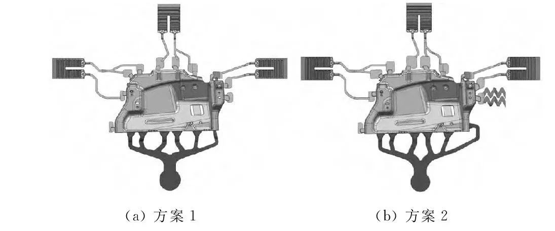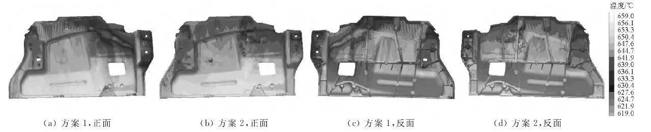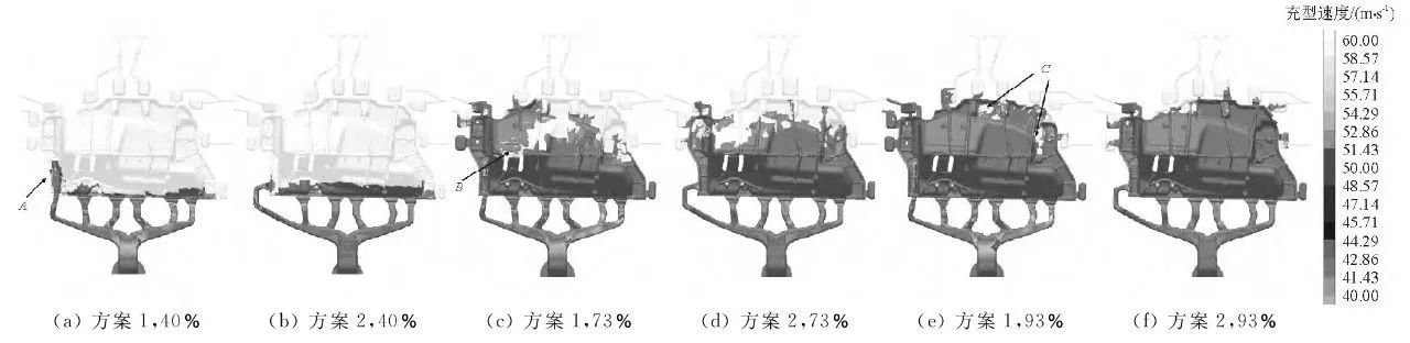 圖3 2種方案充型速度模擬結(jié)果 可以看出,方案1的溫度分布很不均勻,靠近鑄件中間區(qū)域有很大面積的溫度較低,不超過630℃,而其他區(qū)域的溫度都達到645℃以上,形成了較大的溫度差,使得該區(qū)域在凝固過程中的速度不一致,有明顯的凝固時間差,導(dǎo)致后凝固的區(qū)域得不到金屬液補縮。易出現(xiàn)嚴(yán)重的縮孔缺陷。方案2的溫度分布較為均勻,鑄件的主體位置溫差不超過3℃。就填充溫度來看,方案2優(yōu)于方案1。當(dāng)填充至40%時,方案1中A位置的填充速度過快,達到50m/s以上,使得速度較快的金屬液會優(yōu)先填充鑄件,導(dǎo)致鑄件填充不均勻。當(dāng)填充至73%時,因為A區(qū)域的金屬液填充過快,使得在與速度較慢的金屬液混合時會形成未填充的空白區(qū)域,見圖3c中B區(qū)域。該區(qū)域由于被兩股金屬液包圍而后才慢慢被填充,導(dǎo)致該區(qū)域容易出現(xiàn)憋氣現(xiàn)象。當(dāng)填充至90%時,出現(xiàn)了大片容易憋氣的區(qū)域,見圖3e中C區(qū)域。相較于方案1,方案2的充型速度模擬效果更好。