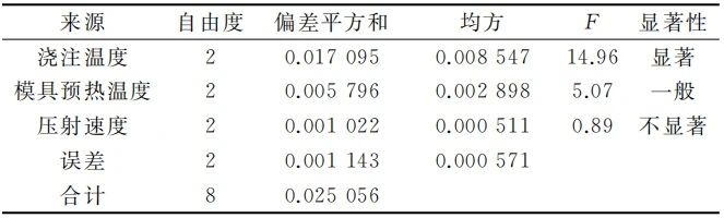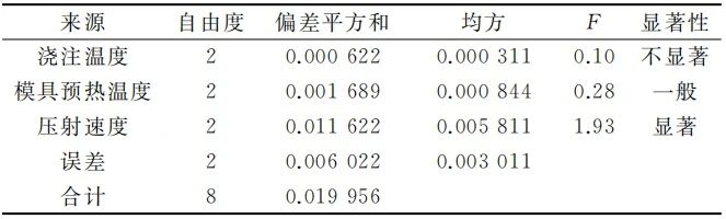 表6 方差分析表 在僅考慮縮孔率的情況下,可知,A>B>C,即壓鑄工藝參數(shù)對縮孔率的影響程度由大到小依次為:澆注溫度、模具預(yù)熱溫度、壓射速度。在僅考慮縮孔率的情況下,滿足信噪S/N2最大的壓鑄工藝參數(shù)組合為A1B2C1,即澆注溫度為660℃、模具預(yù)熱溫度為180 ℃、壓射速度為4.5m/s。