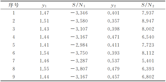 表3 田口正交表及結(jié)果統(tǒng)計 對于卷氣率、縮孔率這兩個響應(yīng)目標(biāo)而言,均符合田口試驗質(zhì)量特性中的望小特性,故信噪比S/N的計算公式為:
