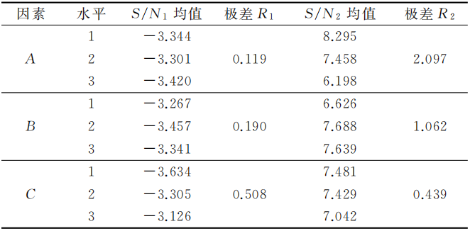 表4 信噪比計算結(jié)果 在僅考慮卷氣率的情況下,從表5可知,C>B>A,即壓鑄工藝參數(shù)對卷氣率的影響程度由大到小依次為:壓射速度、模具預(yù)熱溫度、澆注溫度。可以得到,在僅考慮卷氣率情況下,滿足信噪比S/N1最大的壓鑄工藝參數(shù)組合為A2B1C3,即澆注溫度為680℃、模具預(yù)熱溫度為160℃、壓射速度為6.5m/s。