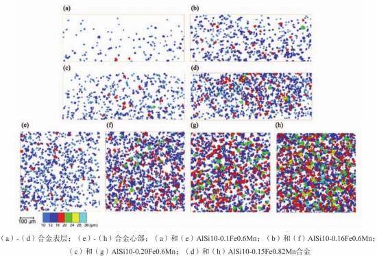 圖8 壓鑄AlSi10MgMn alloys 合金等效直徑超過10 μm的富Fe金屬間化合物 基于富Fe金屬間化合物的等效直徑對具有不同錳和Fe含量的合金表層及心部金屬間化合物進行了定量分析,如圖9所示。此外,還提取了不同等效直徑金屬間化合物的三維形貌。由圖可知,對于所有合金而言,心部的金屬間化合物數量遠多于表層。各合金中的金屬間化物特征如下。