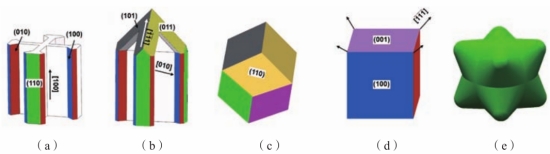 圖9 壓鑄AlSi10-0.10Fe0.60Mn、AlSi10-0.16Fe0.60Mn、AlSi10-0.20Fe0.60Mn和AlSi10-0.15Fe0.82Mn合金基于等效直徑的富Fe金屬間化合物數量分布 (1)初生相為α-Al相的高真空壓鑄AlSi10 -0.10Fe0.6Mn和AlSi10-0.16Fe0.60Mn合金:等效直徑小于16 μm的金屬間化合物呈現不規則多面體形狀,而直徑超過16 μm的則呈現漢字狀。這些金屬間化合物在表層均勻分布,而部分金屬間化合物在心部相互連接; (2)初生相為α-Fe相的高真空壓鑄AlSi10-0.20Fe0.6Mn和AlSi10-0.15Fe0.82Mn合金:等效直徑小于16 μm的金屬間化合物呈現六面體狀,直徑超過16 μm的則呈現六面體和八角枝晶狀。這兩種合金最大金屬間化合物的等效直徑均超過20 μm,且在表層和心部均發現相互連接的金屬間化合物。 壓鑄AlSi10MgMn合金中的初生富Fe金屬間化合物在{100}晶面上形核,并沿著<100>方向生長成為枝晶。結合圖10壓鑄AlSi10-0.15Fe0.82Mn合金不同體積富Fe金屬間化合物形貌可知,初生α-Fe相有著更為復雜的生長過程。α-Fe相在初始生長階段呈現出多面體形貌,如圖10(a)和(b)。在進一步生長過程中,優先生長方向會呈現出更高的生長速率,使得α-Fe相擴展為六面體,如圖10(c)所示。隨后,各面中心處的溶質擴散受到限制,六面體頂點和棱邊的快速生長導致面心出現凹陷。如圖10(d)和(e)。由于面心處富含溶質,六面體的八個頂點向外生長并形成枝晶,最終呈現出對稱的八角枝晶狀,如圖10(f)。 根據圖10,在圖11中提出了壓鑄AlSiMgMn合金中初生α-Fe的生長機理示意圖。當α-Fe晶胞尺寸超過臨界值后,表面的微小凸起沿著<100>方向擇優生長;隨著生長進行,前方溶質發生堆積,<111>方向生長速度加快,形成中空骨架,如圖11(b);隨著生長進行,中空面變小至消失,形成被{110}面包裹的十二面體,如圖11(c);后橫向生長為被{100}面包裹的類正六面體,如圖11(c) ,[此處指圖10(c)]和圖11(d);在高冷卻速度下,六面體面心處溶質難以擴散形成富集,而頂角處溶質易擴散,使<111>方向生長速度加快,導致六面體面心凹陷,如圖10(d)和(e);8個頂角持續向外生長,如圖11(d),最終形成八角狀枝晶。