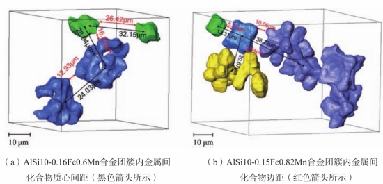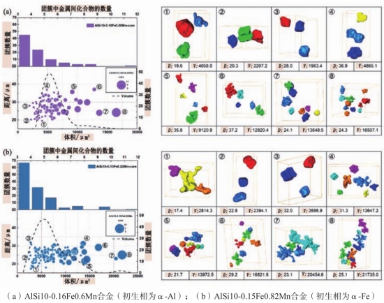 圖12 ADC12壓鑄件孔洞體積的統計分布函數擬合結果 2.2 富Fe相團簇特征 合金中第二相的特征及其分布對合金的力學性能有著重要影響。Khoukhi等人回顧了三種用于測量與泊松過程距離的方法(G函數、F函數和K-里普利函數),并結合斷層掃描技術對消失模鑄造和重力鑄造AlSi合金中孔洞的聚集程度進行了計算。Hannard等人利用瑞士光源X射線斷層掃描對6056、6061和6005鋁合金中金屬間化合物顆粒的團簇特征進行了量化分析,包括顆粒間距、團簇尺寸、團簇內顆粒平均數量以及團簇內顆粒體積分數等。同時在原位拉伸試驗中發現,顆粒的大范圍聚集對斷裂各向異性有著至關重要的影響。對于壓鑄而言,含有壓室預結晶的液態金屬在高速且伴隨紊流的情況下充入型腔,隨后在不同增壓壓力、冷卻速率以及剪切力作用下發生凝固。這導致壓鑄合金表層和偏析帶以及心部呈現顯著不同的微觀組織。通過壓鑄AlSi10MgMn合金的原位拉伸試驗發現,聚集的10 μm富Fe金屬間化合物對主裂紋擴展起著決定性作用。這再次凸顯了合金中第二相特征及分布對其力學性能影響的重要性。因此,開展化學成分和工藝參數對壓鑄鋁/鎂合金中第二相團簇特征影響的研究十分重要。 作者對初生相為α-Al相的高真空壓鑄AlSi10-0.16Fe0.60Mn合金和初生相為α-Fe相的AlSi10-0.15Fe0.82Mn合金中的富Fe金屬間化合物進行G函數分布計算。結果表明,初生相為α-Al相合金心部的金屬間化合物分布較為分散,而后一種合金中的金屬間化合物更易于聚集。此外,結合二分K均值算法(Bisecting K-means)和基于密度的空間聚類算法(DBSCAN)對金屬間化合物的空間聚類特征進行了量化并列于表3中。這些特征包括團簇內金屬間化合物數量(Ni)、團簇內金屬間化合物質心間距(D)、團簇數量(Nc)以及團簇內金屬間化合物體積(V)。圖13展示了高真空壓鑄AlSi10-0.16Fe0.6Mn(初生α-Al相)和AlSi10-0.15Fe0.82Mn(初生α-Fe相)合金心部具有代表性的富Fe金屬間化合物團簇。結合圖表可知,在前一種合金中,多面體和漢字狀的富Fe金屬間化合物在表層均勻分布。而在合金的心部,這些金屬間化合物則會發生聚集,并且部分相互連接。在初生相為α-Fe相的合金中,金屬間化合物多為六面體和八角枝晶狀,并相互連接,且無論是在表層還是心部均發生聚集。這是因為在充型過程中,壓室內形成的初生α-Fe金屬間化合物相互碰撞,在隨后的凝固過程中生長并發生連接,進而導致了團簇的形成。如圖14所示,漢字狀和相互連接的金屬間化合物使得團簇內金屬化合物間距大幅減小。
