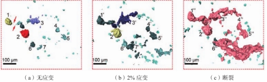 圖2 疲勞試樣內部微觀孔洞的三維X射線斷層掃描結果