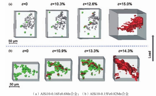 圖18 不同載荷下的壓鑄鋁合金多面體富Fe相及縮孔 通過在X射線斷層掃描設備上加裝機械測試系統,可以觀測合金變形過程中內部組織結構的演變和動態損傷過程。這種組合方法被稱作四維(三維加時間)原位X射線斷層掃描技術,能夠定量分析合金變形過程中內部結構演變,提供動態損傷過程詳細信息,已被用于表征內部結構損傷過程以及量化孔洞的形核與生長特征。作者使用配備拉伸臺的蔡司(ZEISS)Xradia520versa三維X射線斷層掃描儀器,分別對壓鑄AlSi10-0.16Fe0.6Mn(初生相為α-Al)和AlSi10-0.15Fe0.82Mn合金(初生相為α-Fe)進行了原位拉伸試驗。如圖19所示,展示了不同應變下合金的損傷情況,并定量分析了裂紋的起源與擴展。對于初生相為α-Al的合金,共晶富Fe金屬間化合物在高應變下發生破壞,形成的小尺寸微裂紋且難以擴展。隨著應變增加,縮孔體積增大并與團簇內微裂紋連接,導致主裂紋通過裂紋尖端的金屬間化合物團簇進行擴展。對于初生相為α-Fe的合金,團簇內的金屬間化合物在低應變時斷裂,微裂紋相互連接,形成了主裂紋并加速擴展,如圖19(b)所示。