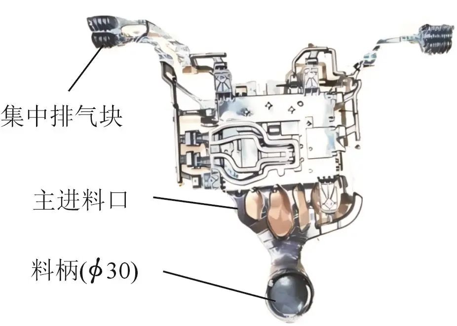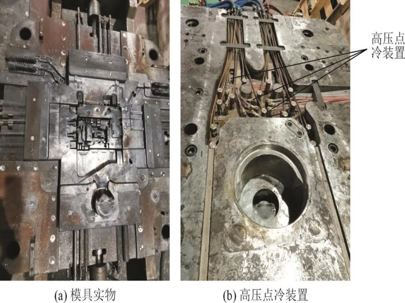 圖4 模具與高壓點(diǎn)冷裝置 整個(gè)進(jìn)料系統(tǒng)中,鋁合金液流過(guò)每一截面的速度與截面積成反比: S1v1=S2v2=S3v3 式中,S1為料筒(料柄)截面積;v1為壓射頭二快速度;S2為主流道截面積;v2為鋁合金液流過(guò)主流道的速度;S3為內(nèi)澆口截面總面積;v3為鋁合金液流過(guò)內(nèi)澆口速度。模具設(shè)計(jì)中需要避免進(jìn)料系統(tǒng)中單個(gè)截面變速過(guò)大,增速過(guò)大會(huì)導(dǎo)致快速?zèng)_蝕澆口,減速過(guò)大會(huì)產(chǎn)生局部冷隔或澆不足等缺陷。模具澆口和排氣系統(tǒng)設(shè)計(jì)數(shù)據(jù)見(jiàn)表1。