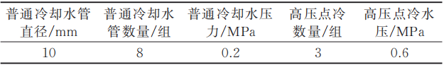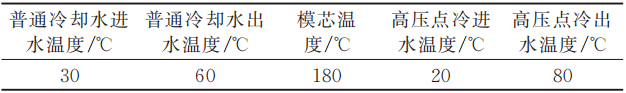為了確保鋁合金液在填充過(guò)程中保持增速,根據(jù)實(shí)踐驗(yàn)證,合金液在填充過(guò)程中,單級(jí)加速比小于4時(shí)壓力損失較小。模具料筒截面積、主流道截面積、內(nèi)澆口截面積比經(jīng)過(guò)優(yōu)化為9.8:3.17:1。5股主進(jìn)料口可以滿足鋁合金液快速充填逆變器殼體主體部分和水冷卻位置,但是到達(dá)側(cè)壁的阻力較大,經(jīng)過(guò)現(xiàn)場(chǎng)測(cè)量失溫較大,側(cè)壁處會(huì)產(chǎn)生冷隔、花斑等缺陷,因此模具側(cè)面需要增加兩路輔助澆口進(jìn)料來(lái)改變型腔內(nèi)冷料和高溫氣體的流向,減小充填阻力,降低鑄造壓力,避免產(chǎn)生脹?,F(xiàn)象。鑄件分型面披鋒控制在0.12 mm以內(nèi),以消除毛刺。 模具設(shè)計(jì)了普通冷卻運(yùn)水和3組高壓點(diǎn)冷裝置,見(jiàn)表2,實(shí)現(xiàn)了模芯、滑塊、內(nèi)澆口等處的溫度基本一致,均保持在180 ℃左右。高壓點(diǎn)冷將鑄件局部壁厚處的熱量通過(guò)純水傳導(dǎo)出去,在一個(gè)壓鑄循環(huán)周期內(nèi)將模具溫度降到160 ℃左右,實(shí)現(xiàn)了模具溫度的動(dòng)態(tài)平衡,不需要通過(guò)噴水來(lái)降低模具溫度,縮短了噴霧時(shí)間,降低局部粘?,F(xiàn)象,改善了因大量噴涂可能產(chǎn)生的氣孔。 表2 冷卻系統(tǒng)設(shè)計(jì)