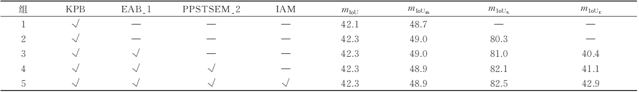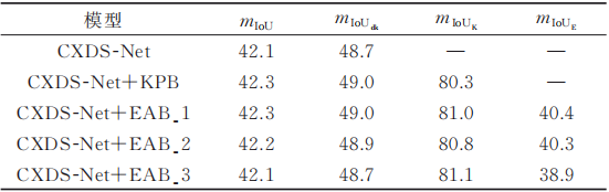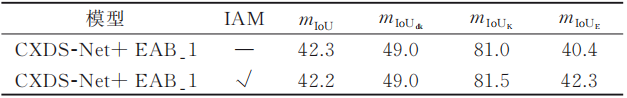 本試驗(yàn)采用 CXDS-Net+ EAB_1 模型作為基準(zhǔn)網(wǎng)絡(luò)。由試驗(yàn)結(jié)果可知,提出的 3 種 PPSTSEM 均可以有效地提高模型在關(guān)鍵位置分割任務(wù)上的分割精度,其中PPSTSEM_2 在mIoUK和mIoUE 指標(biāo)上均達(dá)到最佳。 為了進(jìn)一步在保證缺陷分割精度的同時提高關(guān)鍵位置處的分割精度,提出了一種交互式注意力模塊,在關(guān)鍵位置解碼階段,通過對關(guān)鍵位置解碼特征和關(guān)鍵位置邊界解碼特征分別通過注意力機(jī)制模塊進(jìn)行互補(bǔ)融合來提高各自任務(wù)的分割精度。本試驗(yàn)以 CXDSNet+EAB_1 模型為基準(zhǔn)網(wǎng)絡(luò),對 IAM 模型的有效性進(jìn)行驗(yàn) 證 ,結(jié)果見表3??梢钥闯?,在解碼階段引入IAM后,通過對關(guān)鍵位置特征及其邊界特征進(jìn)行互補(bǔ)融合后,模型在mIoUK和mIoUE指標(biāo)上均有所提升,從而驗(yàn)證了提出 IAM 對關(guān)鍵位置分割任務(wù)的有效性。進(jìn)一步對驗(yàn)證將各個模塊集成到基準(zhǔn)網(wǎng)絡(luò)后模型的有效性,試驗(yàn)結(jié)果見表4。由試驗(yàn)結(jié)果可知,提出的多任務(wù)缺陷分割模型可以同時提高在缺陷分割和關(guān)鍵位置分割這兩個具有低相關(guān)性任務(wù)的分割精度,可以很好地滿足在實(shí)際質(zhì)檢過程中同時對缺陷區(qū)域和關(guān)鍵位置區(qū)域分割的需求。 表3 基準(zhǔn)模型在采用交互式注意力模塊的結(jié)果