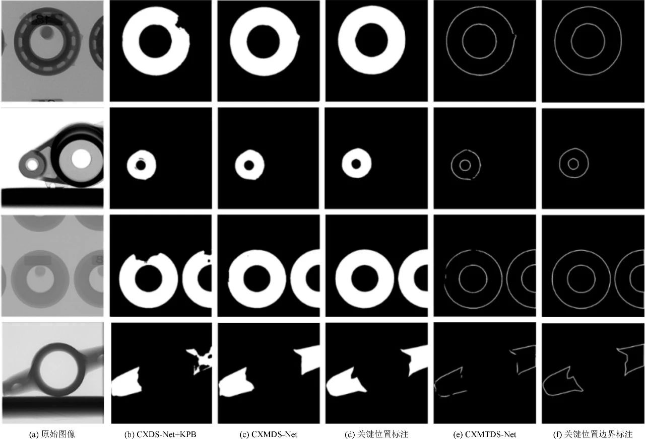 圖9為CXDS-Net+KPB和提出的多任務(wù)分割模型CXMTDS-Net對關(guān)鍵位置及其邊界的分割結(jié)果示例。從分割結(jié)果可知,CXMTDS-Net模型相比于CXDS-Net+KPB對關(guān)鍵位置的分割性能有顯著提升,CXDS-Net+KPB僅在具有顯著邊界的關(guān)鍵位置的分割效果較好,而在邊界模糊的區(qū)域的分割精度需要進(jìn)一步改進(jìn),而CXMTDS-Net在對關(guān)鍵位置邊界不明顯的區(qū)域具有更好的分割精度,見圖10,可見提出的模型可以實(shí)現(xiàn)對缺陷區(qū)域的精準(zhǔn)分割。