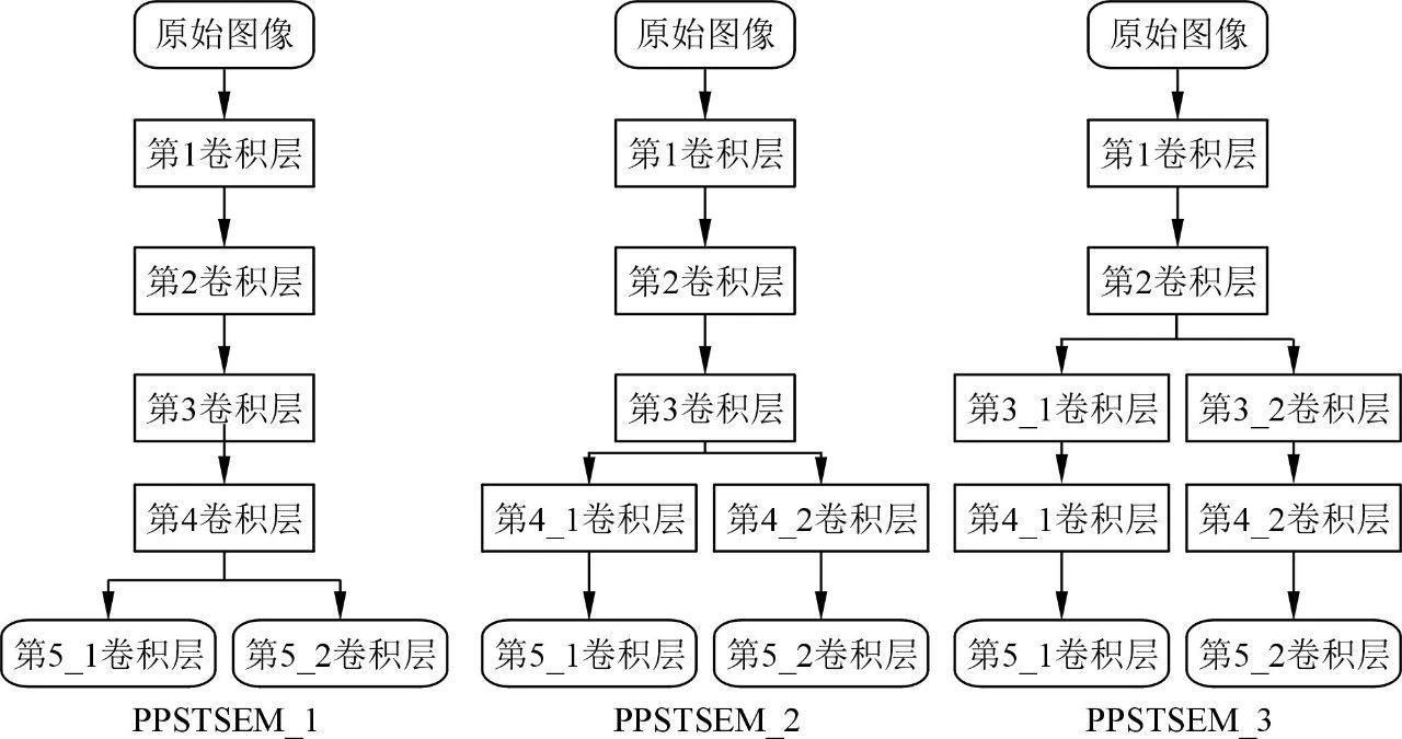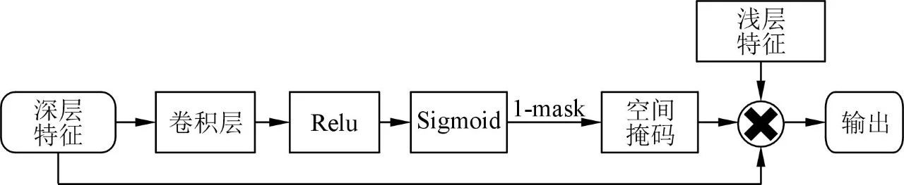 圖5 邊界感知的關(guān)鍵位置分割解碼器策略 在高相關(guān)性的多任務(wù)分割任務(wù)中,研究者廣泛采用共享編碼器的方式同時對各個任務(wù)相關(guān)的特征進(jìn)行編碼,通過在多任務(wù)監(jiān)督下參數(shù)共享的編碼器可以提取互補(bǔ)的特征,分別提高各個任務(wù)的分割精度。對于低相關(guān)性的多任務(wù)分割編碼模型而言,在淺層編碼階段,可以從圖像中提取出鋁合金壓鑄件的結(jié)構(gòu)特征、邊界信息和壓鑄缺陷的紋理信息。在深層編碼階段會對不同的區(qū)域進(jìn)行深度語義特征提取,在同一編碼模塊中并不能提高有效的互補(bǔ)語義信息,這種直接參數(shù)共享編碼的方法反而會降低兩個任務(wù)的分割精度。 在淺層特征提取階段通過參數(shù)共享的方式同時對壓鑄缺陷的紋理特征和關(guān)鍵位置的紋理信息以及邊界特征進(jìn)行編碼。在提出的PPSTSEM中,新設(shè)計(jì)的深層編碼分支的卷積層參數(shù)與原始編碼對應(yīng)卷積層的模型參數(shù)保持一致,根據(jù)采用深層編碼層級的不同,可以將在PPSTSEM的深層編碼分支分為3種:只采用第5_1卷積層,采用第4_1、第5_1卷積層,采用第3_1、第4_1、第5_1卷積層,見圖6,在試驗(yàn)環(huán)節(jié)中將對采用不同層級的深層編碼階段進(jìn)行驗(yàn)證。 為了進(jìn)一步提高對關(guān)鍵位置分割任務(wù)的分割精度,提出了一種交互式注意力模塊(Interactive Attention Module,IAM),見圖7,通過采用與本任務(wù)具有高相關(guān)的其他任務(wù)的特征,引入注意力機(jī)制模塊獲取本任務(wù)特征的注意力圖,對提取的注意力圖取反獲得互補(bǔ)的注意力圖,將互補(bǔ)的注意力圖與來自其他任務(wù)的特征進(jìn)行像素級相乘來獲取與本任務(wù)互補(bǔ)的特征,進(jìn)一步與原始特征進(jìn)行像素級的相加來得到模塊的輸出特征。