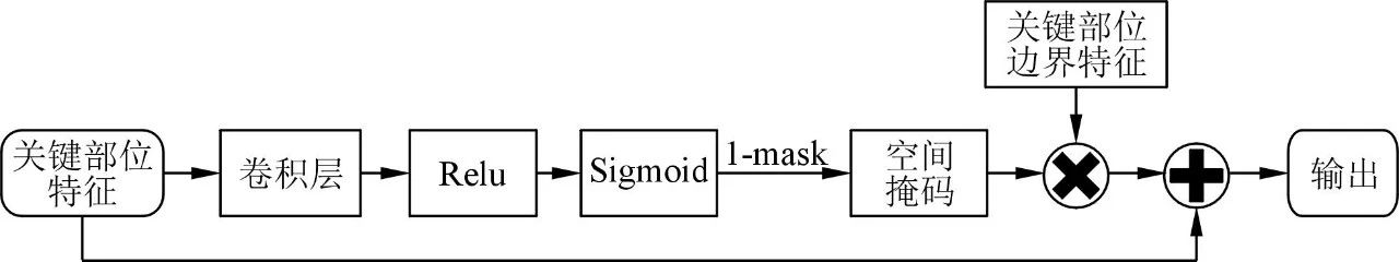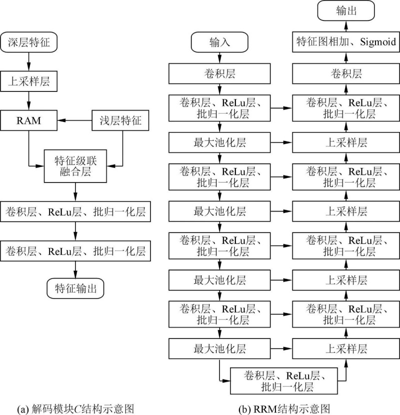 圖10 CXMTDS-Net分割結(jié)果示例 針對缺陷分割和關(guān)鍵位置分割任務(wù)提出了多任務(wù)分割模型CXMTDS-Net,可以有效提升關(guān)鍵位置分割精度。為了提升顯著性目標(biāo)的分割精度,F(xiàn)AN D P等提出了一種反向注意力模塊(Reverse Attention Module,RAM),見圖11。通過該模塊可以挖掘分割區(qū)域與其邊界之間的內(nèi)在聯(lián)系,從而提高模型對目標(biāo)區(qū)域的分割精度。QIN X B等提出了一種殘差細(xì)化模塊(Residual Refinement Module,RRM),設(shè)計(jì)了一種編碼和解碼的結(jié)構(gòu)對模型預(yù)測的結(jié)果進(jìn)行修正,從而提高模型在邊界區(qū)域的分割精度。以CXDS-Net +EAB_2+ PPSTSEM_2為基準(zhǔn)網(wǎng)絡(luò)分別將RAM和RRM方法與基準(zhǔn)網(wǎng)絡(luò)融合與所提出的CXMTDS-Net模型進(jìn)行定量對比,從而驗(yàn)證提出的方法對提高關(guān)鍵位置分割精度的有效性,見圖12。