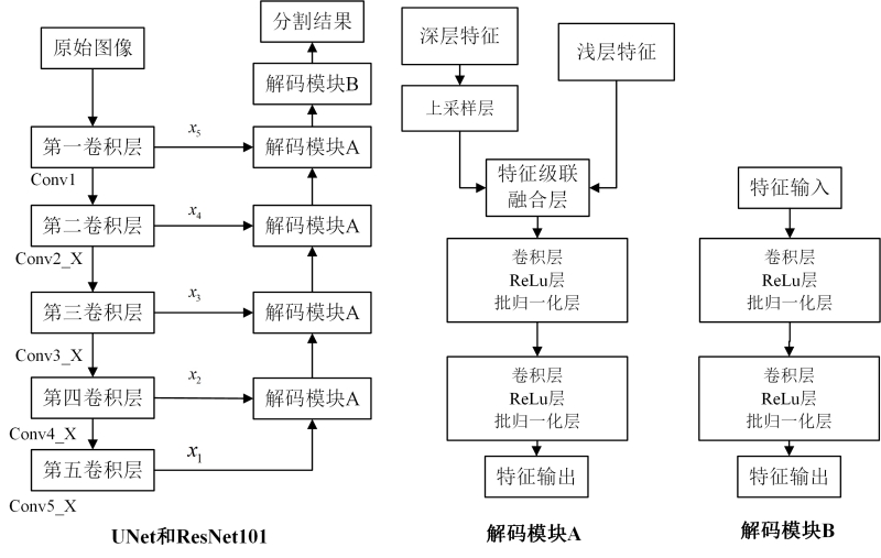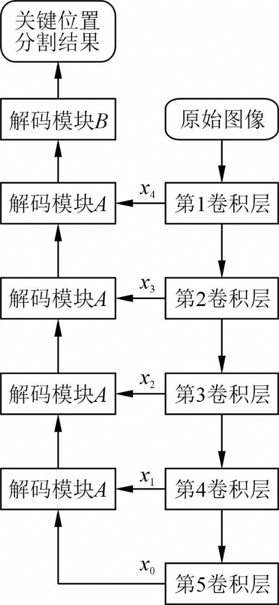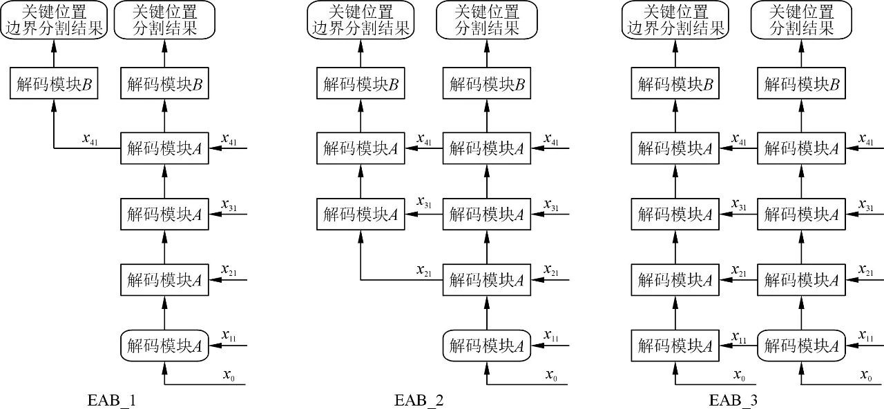圖3 鋁合金壓鑄件X射線圖像缺陷分割模型 由于壓鑄缺陷分割任務(wù)和鑄件關(guān)鍵位置分割任務(wù)之間的低相關(guān)性,直接在缺陷分割解碼器中引入關(guān)鍵位置分割解碼器并不能滿足分割需求。因此,設(shè)計(jì)了針對壓鑄件關(guān)鍵位置分割任務(wù)的解碼器(Key Parts Branch,KPB),見圖2。關(guān)鍵位置在X射線圖像中較為明顯,在解碼器中直接采用經(jīng)過原始圖像編碼后提取的特征即可獲取充足的關(guān)鍵位置處的紋理特征和深層語義特征。在本研究中,將原始圖像編碼的各層級輸出的特征圖分別用x0~x4來表示,關(guān)鍵位置分割解碼器中的解碼模塊A和B的具體結(jié)構(gòu)見圖4。雖然鋁合金壓鑄件中的關(guān)鍵位置在X射線圖像中的特征較為明顯,但是關(guān)鍵位置的外形和位置多樣,且在關(guān)鍵位置的部分邊界存在不連貫處,直接采用關(guān)鍵位置解碼器進(jìn)行分割時,部分分割結(jié)果會在邊界處的分割精度較低。提出邊界感知解碼器來對關(guān)鍵位置的邊界進(jìn)行分割,見圖5,根據(jù)編碼層級的不同,分別設(shè)計(jì)了3種邊界感知模塊(Edge-Aware Branch,EAB),在EAB_1中,利用編碼模塊中的淺層特征—x4特征圖像,同時進(jìn)行對關(guān)鍵位置分割及其邊界進(jìn)行分割。在EAB_2中,設(shè)計(jì)了3個解碼模塊分別利用編碼模塊中的x2、x3、x4特征圖同時進(jìn)行語義分割和邊界分割。在EAB_3中,設(shè)計(jì)了和KPB一致的解碼器結(jié)構(gòu),充分利用了不同階段的編碼器的特征。在后續(xù)的試驗(yàn)中,將對設(shè)計(jì)基于不同融合階段的EAB模型進(jìn)行定量評價(jià)。