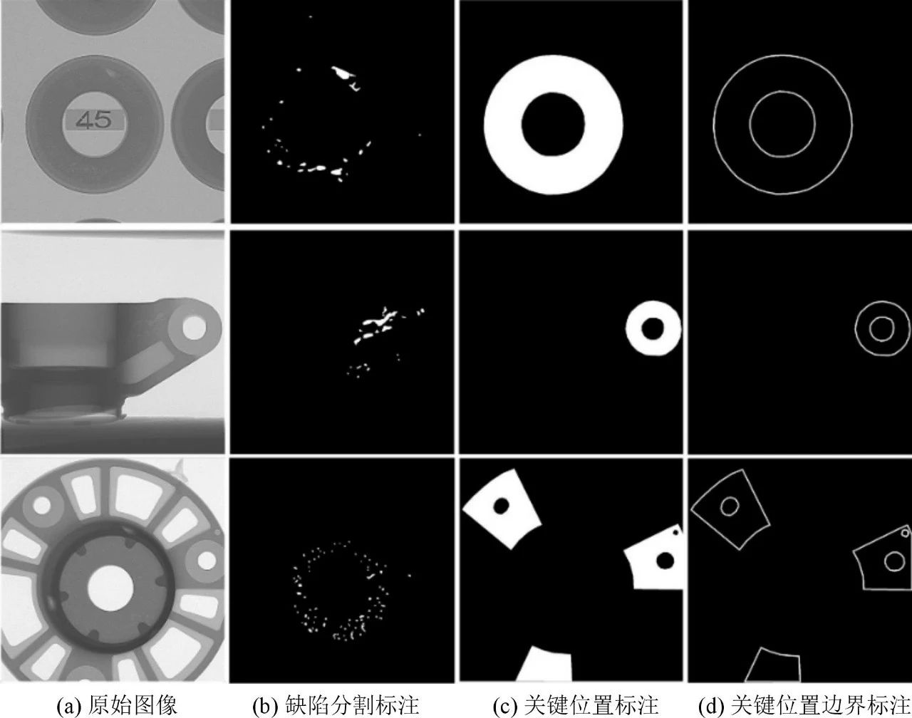 圖7 交互式感知模塊 構(gòu)建了汽車鋁合金壓鑄件X射線圖像的數(shù)據(jù)集,在實(shí)際的汽車零部件檢測過程中,檢測人員將待檢測的零件放置到X射線圖像檢測系統(tǒng)中。X射線檢測系統(tǒng)由4部分組成:X射線發(fā)射源、機(jī)械傳動系統(tǒng)、數(shù)字平板探測器和計(jì)算機(jī)圖像處理系統(tǒng)。 在構(gòu)建的數(shù)據(jù)集中包含3 200張X射線圖像提供了缺陷區(qū)域的人工標(biāo)注結(jié)果,標(biāo)注的內(nèi)容主要包括:缺陷區(qū)域像素級、鋁合金壓鑄件中的關(guān)鍵位置及其邊界像素級,見圖8,其中汽車鋁合金壓鑄件中的關(guān)鍵位置主要包括待加工的孔、端面以及與其他零件配合的表面等。在鋁合金壓鑄件中,如果缺陷出現(xiàn)在關(guān)鍵位置時,會對下一工序的加工及零件后續(xù)的使用過程中造成較大的安全隱患。在質(zhì)檢過程中,需要重點(diǎn)關(guān)注這類關(guān)鍵位置的缺陷分布情況。