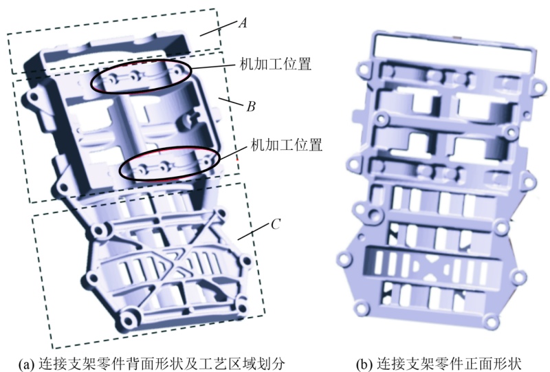 圖1 連接支架零件工藝區域劃分及3D圖 表1 低壓鑄造支架數值模擬初始工藝參數