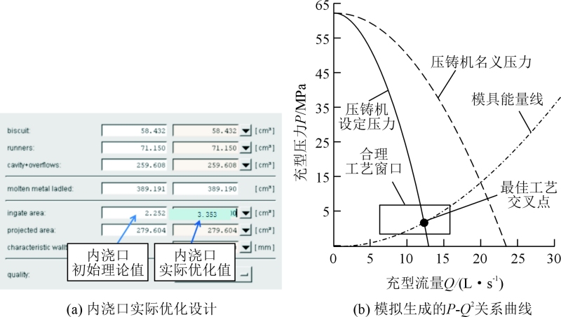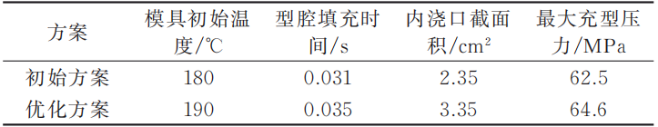 圖6 通過P-Q2關系曲線檢查內澆口設計的合理性 表2 初始工藝與優化方案參數對比表