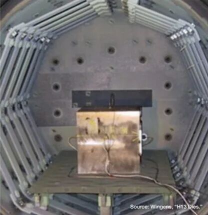 圖3. 通用汽車動力總成16英寸立方體淬火試驗 大型一體化壓鑄模的熱處理挑戰(zhàn) 大型H13鋁壓鑄模具的熱處理傳統(tǒng)上需要在保證足夠淬火速率以獲得良好機(jī)械性能的同時,兼顧控制變形與開裂風(fēng)險之間的平衡。隨著現(xiàn)代汽車及工業(yè)應(yīng)用對更大尺寸壓鑄件的需求日益增長,冶金學(xué)家與設(shè)備供應(yīng)商正聚焦于以下幾個關(guān)鍵發(fā)展方向:在高壓真空爐中實現(xiàn)更快速的淬火技術(shù);采用中斷淬火與等溫控制工藝;以及開發(fā)可應(yīng)對重載荷與高熱負(fù)荷的輔助系統(tǒng)。