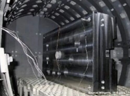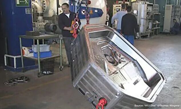 圖6. 德國汽車行業(yè)加工的6噸H13模具,為當(dāng)時(2004年)全球最大 遵守 NADCA 建議:盡管模具尺寸存在差異,NADCA #207 中針對H13壓鑄模具的熱處理基本原則仍然適用。其中,在關(guān)鍵溫度區(qū)間內(nèi)實現(xiàn)最低50°F/min(約28°C/min)的表面冷卻速率,仍是核心工藝目標(biāo)之一。為此,具備高回填能力的真空爐是首選。 精確的溫度控制:現(xiàn)代真空爐配備有先進(jìn)的數(shù)控系統(tǒng)與多熱電偶監(jiān)測裝置,可實時追蹤并調(diào)整溫度曲線,從而確保模具均勻加熱至奧氏體化溫度(H13鋼通常約為1885°F/1030°C),并在淬火及回火過程中實現(xiàn)精確工藝控制。