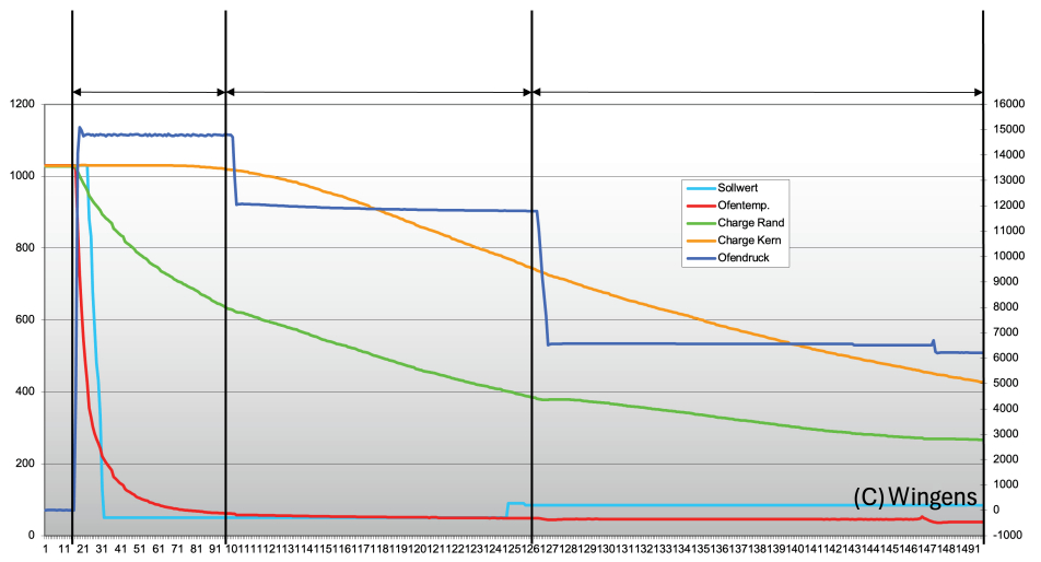 圖7. 淬火壓力15bar,電機(jī)運行至870千瓦(約1170馬力)并逐步降壓 回火:在快速淬火處理后,需進(jìn)行至少兩次回火操作,且每次回火后均應(yīng)冷卻至室溫。通常還會增加一次最終去應(yīng)力回火,以消除工件中的殘余應(yīng)力。 材料科學(xué)的影響:雖然熱處理工藝對模具性能至關(guān)重要,但選用高質(zhì)量的模具鋼材同樣不可或缺。大型一體化壓鑄模具通常采用優(yōu)質(zhì)或特級H13鋼,根據(jù)NADCA #207標(biāo)準(zhǔn),這類鋼材需嚴(yán)格滿足潔凈度、帶狀組織及沖擊韌性等方面的要求。 當(dāng)前持續(xù)的研究正致力于開發(fā)性能更優(yōu)異的模具鋼,例如Dievar與QRO-90等材料,而合理的熱處理工藝仍是充分發(fā)揮這類先進(jìn)模具鋼性能潛力的關(guān)鍵所在。 未來趨勢與展望 大型一體化壓鑄模具的熱處理技術(shù)正處于持續(xù)發(fā)展之中,以滿足汽車行業(yè)日益提升的性能與效率需求。未來的發(fā)展趨勢和重點關(guān)注方向包括: 規(guī)范修訂與適配:北美壓鑄協(xié)會(NADCA)正在評估現(xiàn)行#207規(guī)范對超大型模具的適用性,旨在更有效地應(yīng)對大型模具在檢測方法、質(zhì)量保證體系以及整體性能允許偏差范圍等方面帶來的獨特挑戰(zhàn)。 先進(jìn)過程控制:熱處理模擬與有限元分析(FEM)日益廣泛地用于預(yù)測并優(yōu)化淬火工藝過程,包括對熱梯度的精準(zhǔn)預(yù)估與補(bǔ)償控制。 創(chuàng)新熱處理工藝:諸如馬氏體等溫淬火等新型技術(shù)正在研究中,其作為傳統(tǒng)淬火-回火體系的潛在替代方案,能夠在更短工藝周期內(nèi)實現(xiàn)高硬度與高韌性的綜合性能平衡。 能源效率提升:行業(yè)致力于降低高壓氣淬工藝的能耗,重點通過優(yōu)化真空爐結(jié)構(gòu)設(shè)計及升級控制系統(tǒng)以實現(xiàn)更高效的能源利用。 與工業(yè)4.0/5.0的融合:數(shù)字化與自動化技術(shù)有望推動熱處理工藝的革新,在提升生產(chǎn)效率、優(yōu)化產(chǎn)品質(zhì)量及簡化生產(chǎn)流程方面發(fā)揮關(guān)鍵作用。